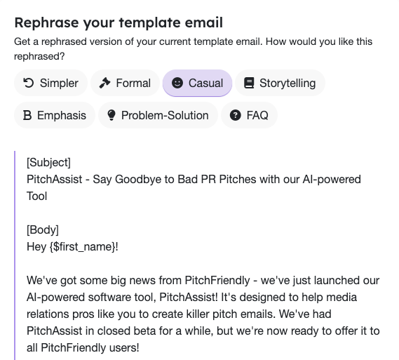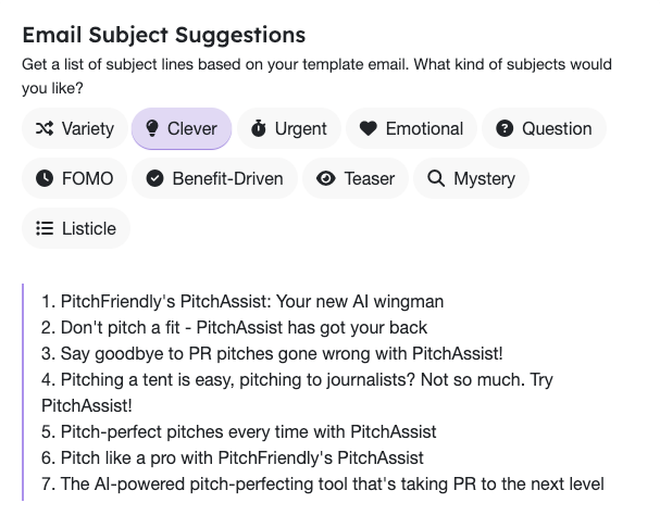Next, choose what kind of assistance you want from PitchAssist. Whether you want some clever subject lines or a more consice email message.